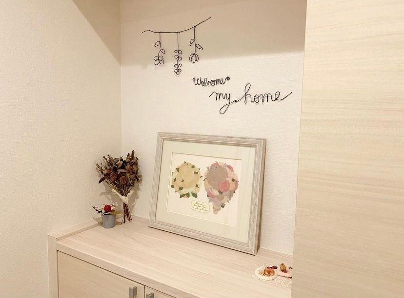 玄関スペースにワイヤークラフトで「welcome my home」ワイヤーなら文字もつくれるので好きな英文にすることができますね。文字のゆるさがとってもかわいく、ぜひ真似したいアイデアです!