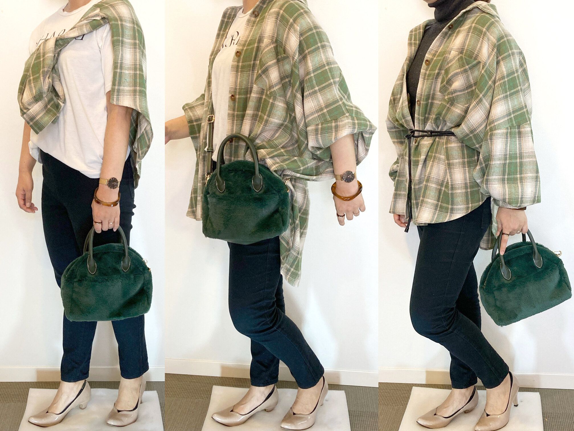 同系色のグリーンのチェックシャツとファーバッグで合わせるのも相性抜群でおすすめです。
