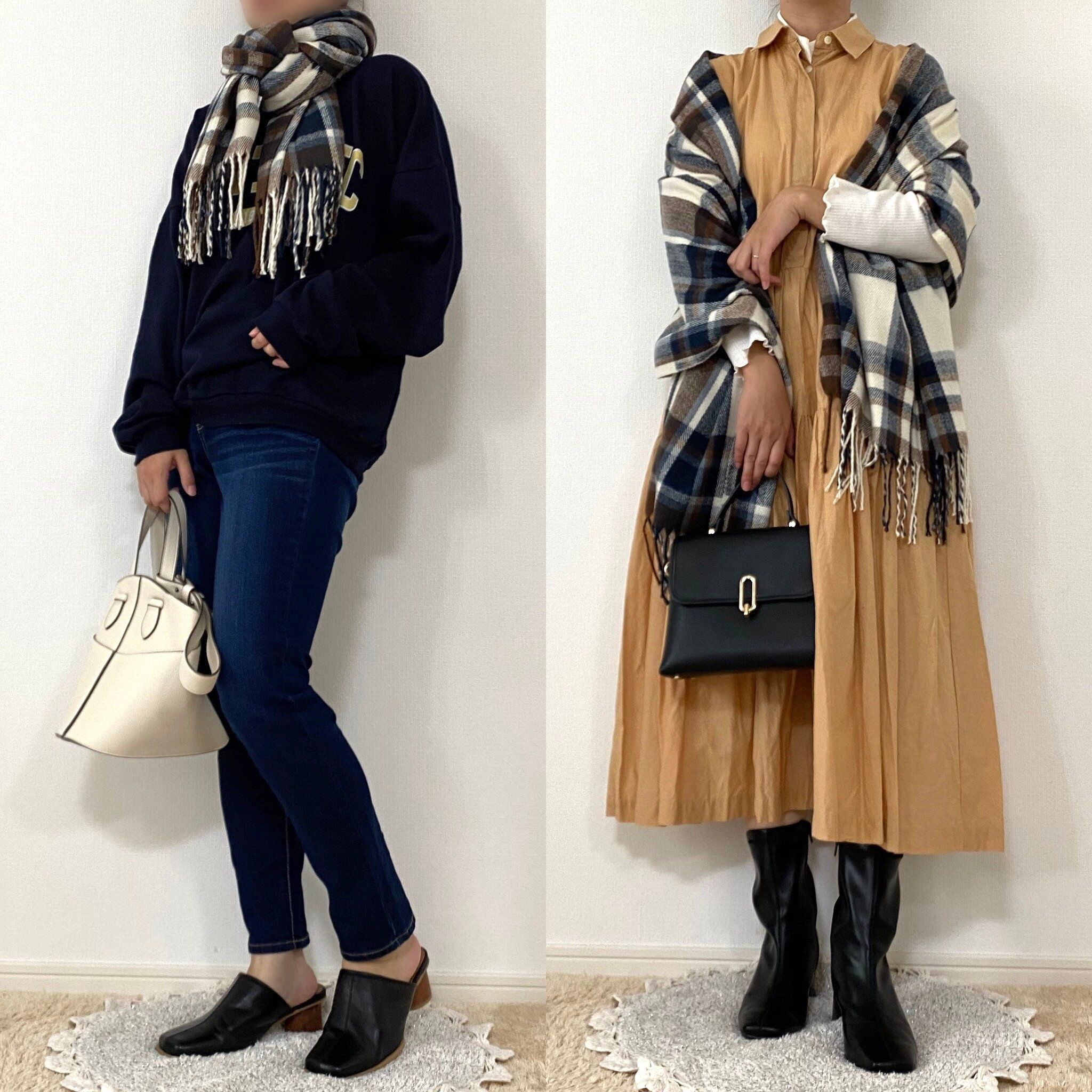左はスウェットとデニムのカジュアルコーデのポイントで首に巻いてみました!大判なので首に巻くとボリュームが出てとてもかわいらしいですし、暖かいので防寒対策にも。
