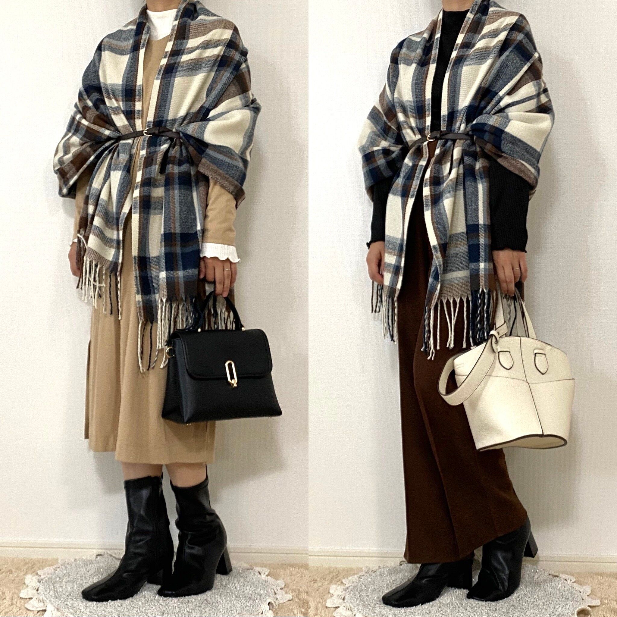 右のように羽織にもちょうど良い大きさなので、まだ気温差が激しい今の時期に重宝しそうです。チェック柄ですが落ち着いた配色なので大人女子にも使いやすいですね。