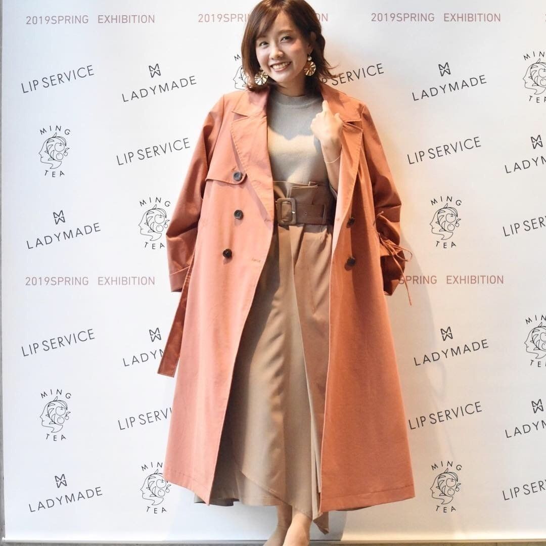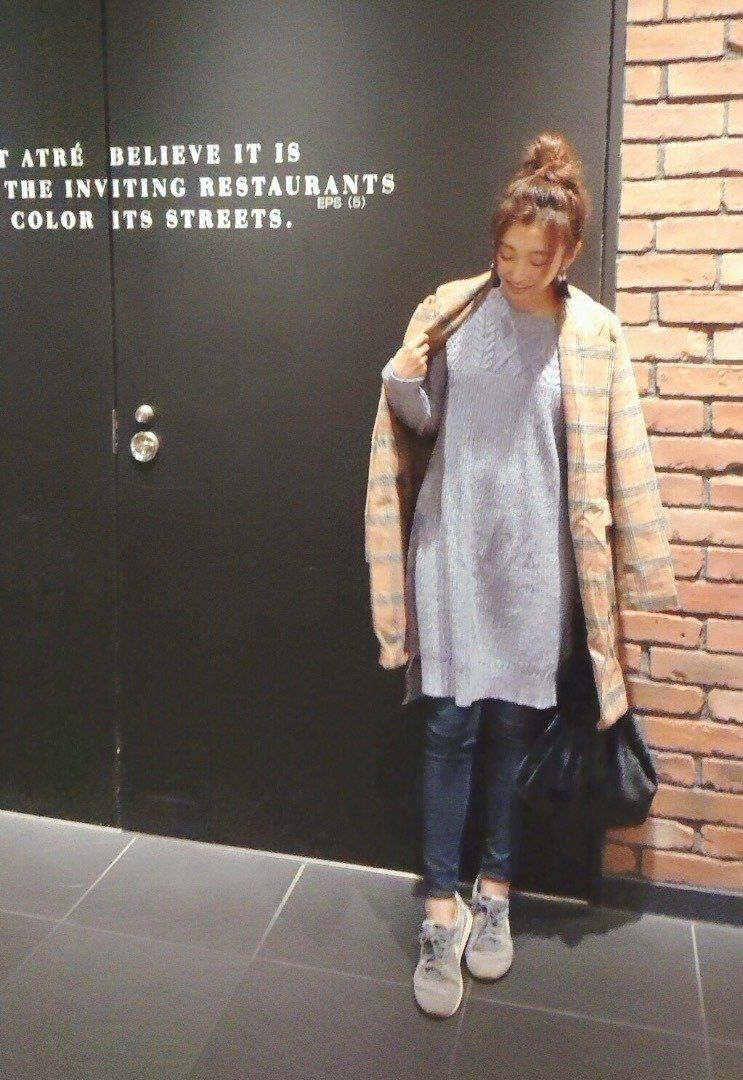 最初にご紹介するのは、動き回る日には楽ちんなスニーカーを履くことが多い小比類巻亜弥さん。スポーティーな印象を与えるスニーカーは、女性らしいニットのチュニックワンピースやスキニーと合わせるとバランスがいいですね。アウターにはコートを肩かけして、「寅さんコーデ」と命名。アップのお団子スタイルも、若見えするポイントです。