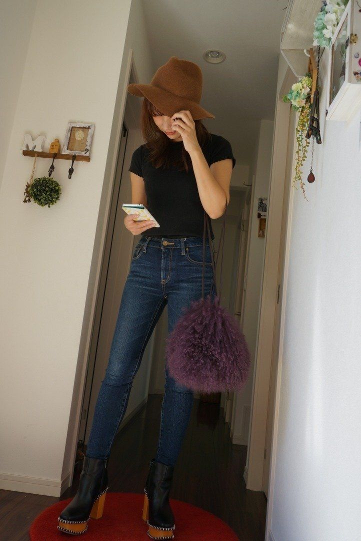 こちらは、ユニクロのリブTシャツとMOUSSYのスキニーデニム、厚底のブーツを組み合わせた、すっきり縦長シルットのコーデです。スキニーとブーツのおかげで、細見え&脚長効果ばつぐん!ハットやインパクトのあるファーバッグが、シンプルコーデにほどよいアクセントを加えています。