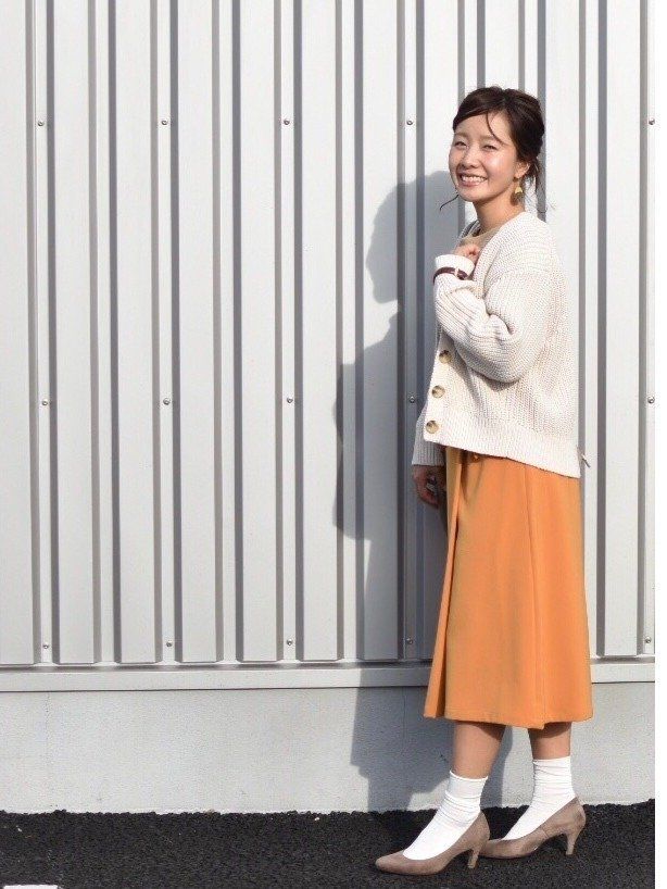 最後のひとりは、きれい色スカートをおしゃれに着こなしている榊山登紀子さんです。ホワイト系のカーディガンや靴下を合わせて、春らしくさわやかなコーデに。季節や流行にあわせると洋服が大量に増えてしまうため、最近はレンタルサービスも活用しているとのことです。