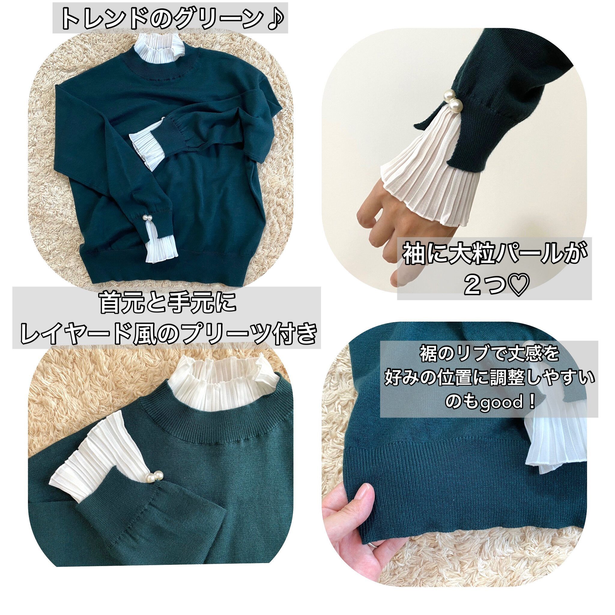 首元と袖に付いているレイヤード風のプリーツがとっても上品でかわいらしい一枚。デザイン性のあるトップスは一枚で着るだけでコーデがオシャレに見える便利アイテムですね!