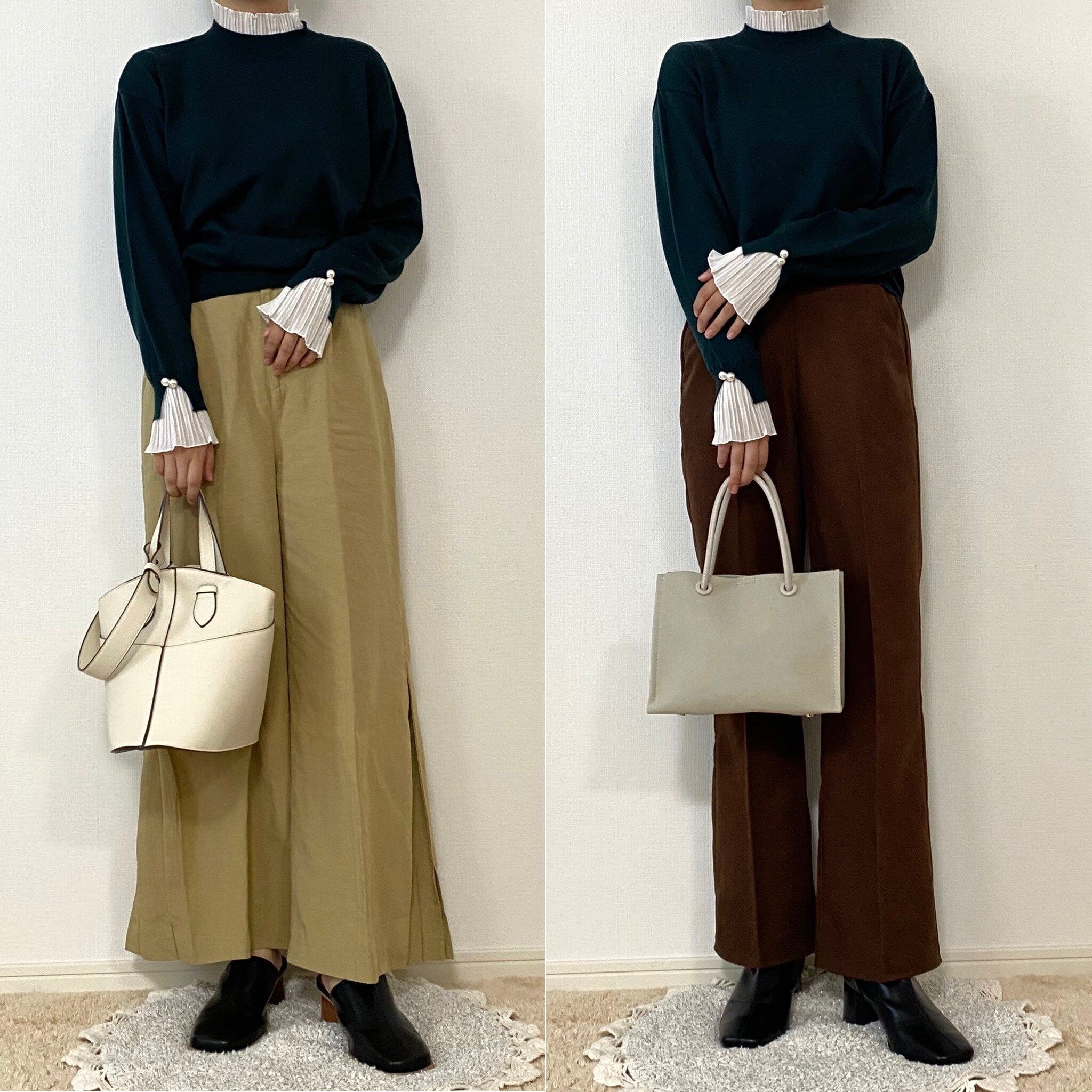 こっくり色のグリーンのニットに秋色パンツだと少し地味な印象になってしまいがちですが、プリーツが付いていることでコーデがマニッシュになりすぎずエレガントな印象をプラスできます!