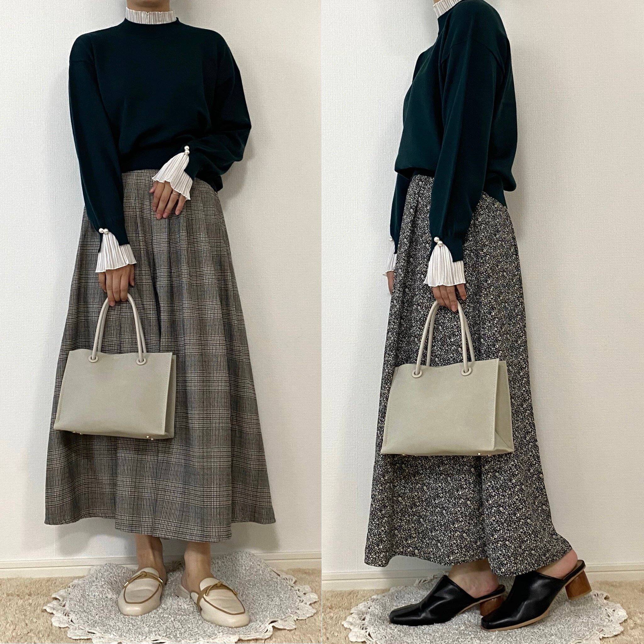 右はブラックの小花柄スカートと合わせました!ニットが無地なので柄アイテムとも合わせやすいですね!