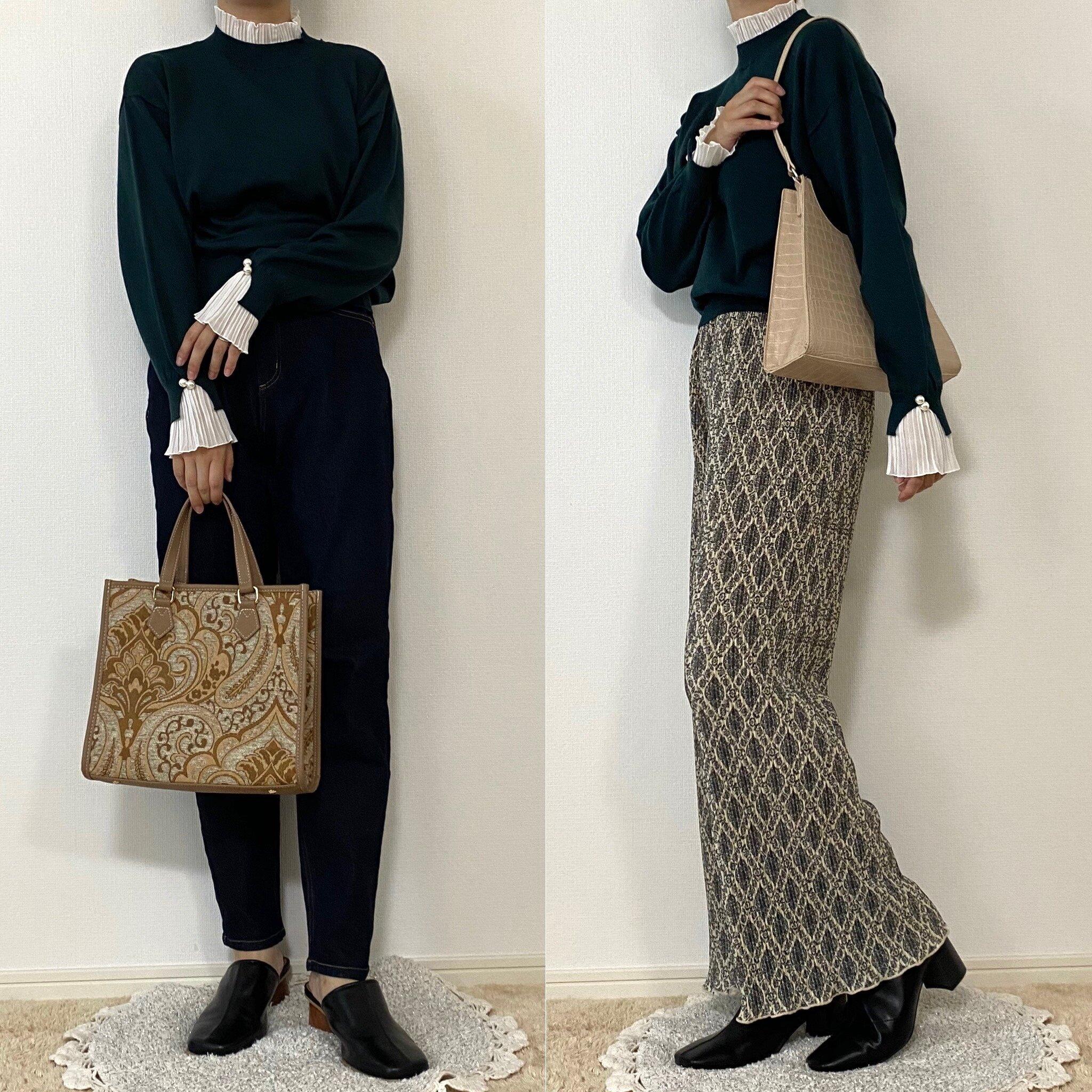 左はテーパードデニムにペイズリー柄のバッグをポイントに。右はダマスク柄のプリーツパンツに合わせて大人っぽくまとめてみました。