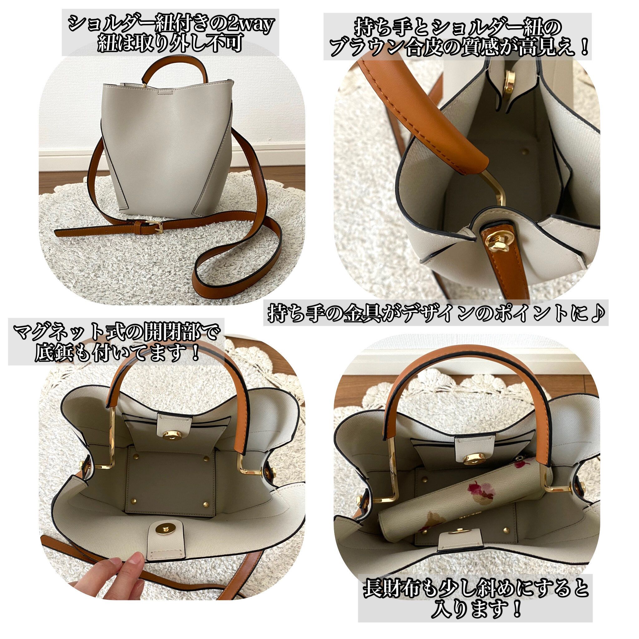 一つ目にご紹介するのはワンハンドルと落ち着いたグレージュカラーが今っぽいこちらの2wayバッグです。