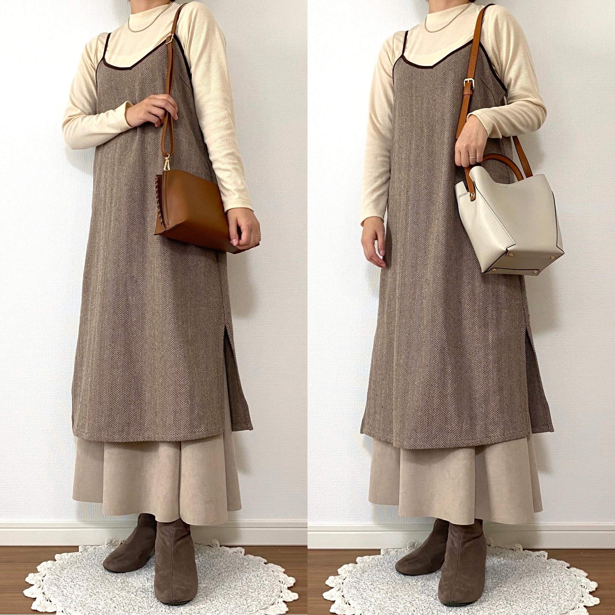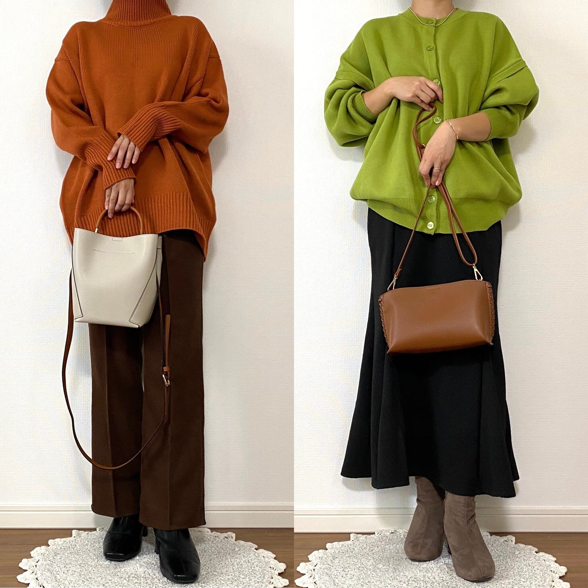 左はブラウンのニット、右はブラウンのヘリンボーン柄フレアパンツと合わせてみました。