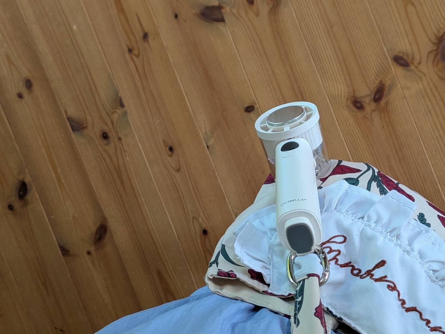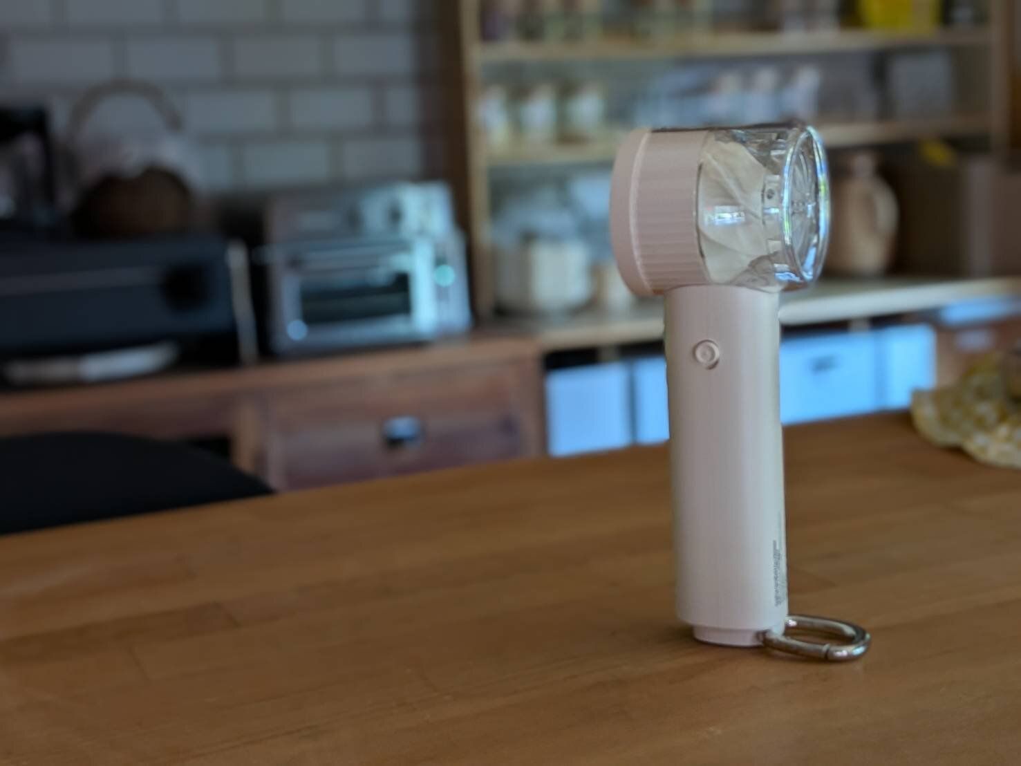 ハンディファンの持ち手部分には、「スタンド」兼「フック」にもなる「カラビナ」が付属。実はこれ、「立てる」&「かける」ことができる仕様になっているんです!
