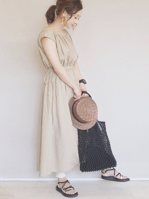 ベージュのギャザーワンピの裾からさりげなく白をのぞかせる、GUのレギンスコーデ。裾メロウがフェミニンなワンピースにマッチします。繊細な紐ベルトのサンダルと組み合わせると、カジュアルなのに女性らしいコーデに仕上がります。