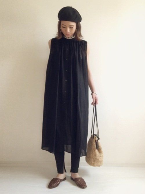 上品で柔らかな風合いのコットンのブラックワンピと、GUのスリットレギンスを合わせたコーデ。薄手ワンピースの裾に透ける、ブラックのレギンスが絶妙です。夏らしい素材の小物使いで、ガーリーな雰囲気の残る大人スタイルが完成。