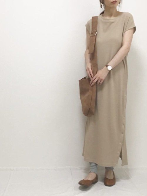 ウエストギャザーのベージュワンピ×白レギンス