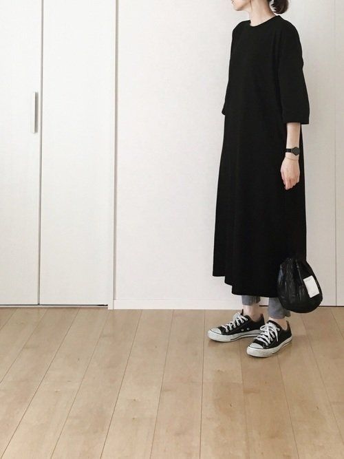 ラフなワンピースと小物を黒で統一したら、レギンスはあえてグレーをチョイス。おすすめは、内スリットでほどよく足首が見えるGUのスリットレギンス。適度な抜け感がプラスされ、こなれた印象になりますよ。