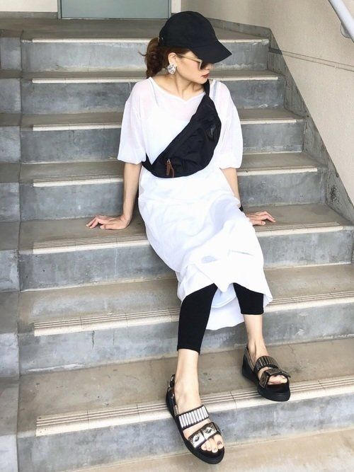透け感のあるホワイトワンピを、ブラックのユニクロ10分丈エアリズムソフトレギンス(1,990円)で着こなすモノトーンコーデ。メタルスニーカーサンダルの光沢感で大人の余裕をかもし出します。シャープでスポーツミックスなスタイルです。