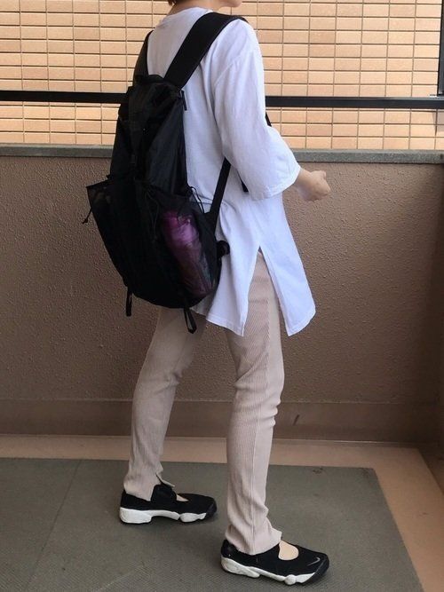 ロング丈のコットンカットソーにユニクロのリブレギンスパンツ(1,990円)を合わせたコーデ。ホワイト×ベージュなら、力の入りすぎないスポーティなスタイルが完成。スニーカーやバッグにブラックを選べば、全体が引き締まります。