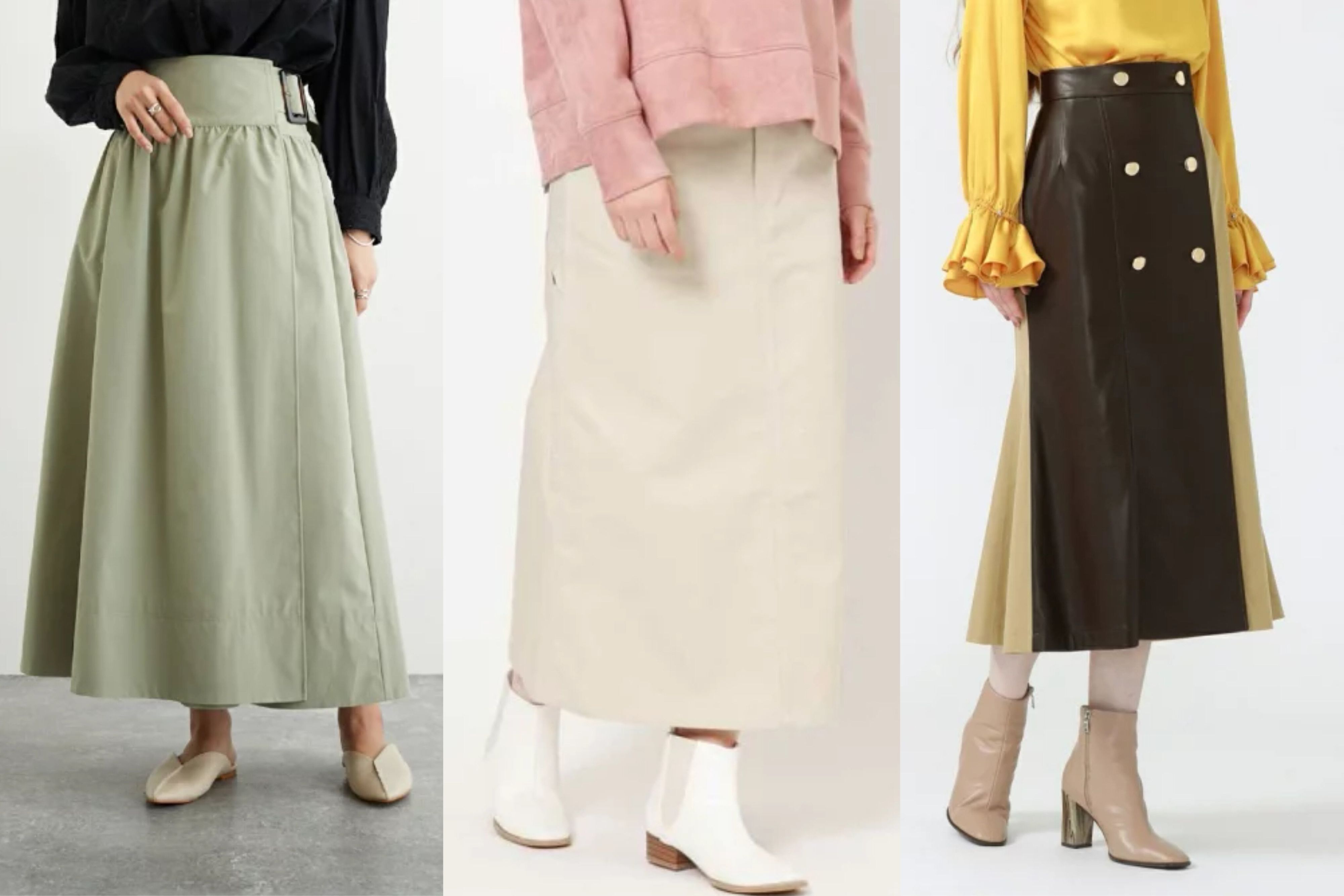 同じようなコーデでも、小物を少し変えるだけでさまざまな表情にチェンジします。トレンチスカートの着回しにも大活躍してくれますよ。