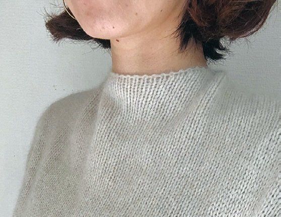 首まわりをカバーするトップスを着ると体感温度がUP。白やライトグレーなら、薄手のニット素材でも春らしい。黒や紺なら、ボトムスを明るい色にするとバランス◎。