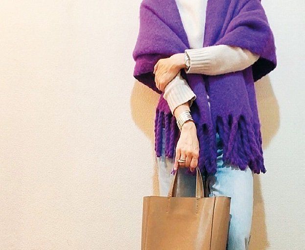 120×90㎝くらいの大判サイズは、巻くとボリュームが出て暖かく、コーデのアクセントにも。初心者さんは、水色やライトグレーなど手持ちの服より1トーン明るめの単色が使いやすい。