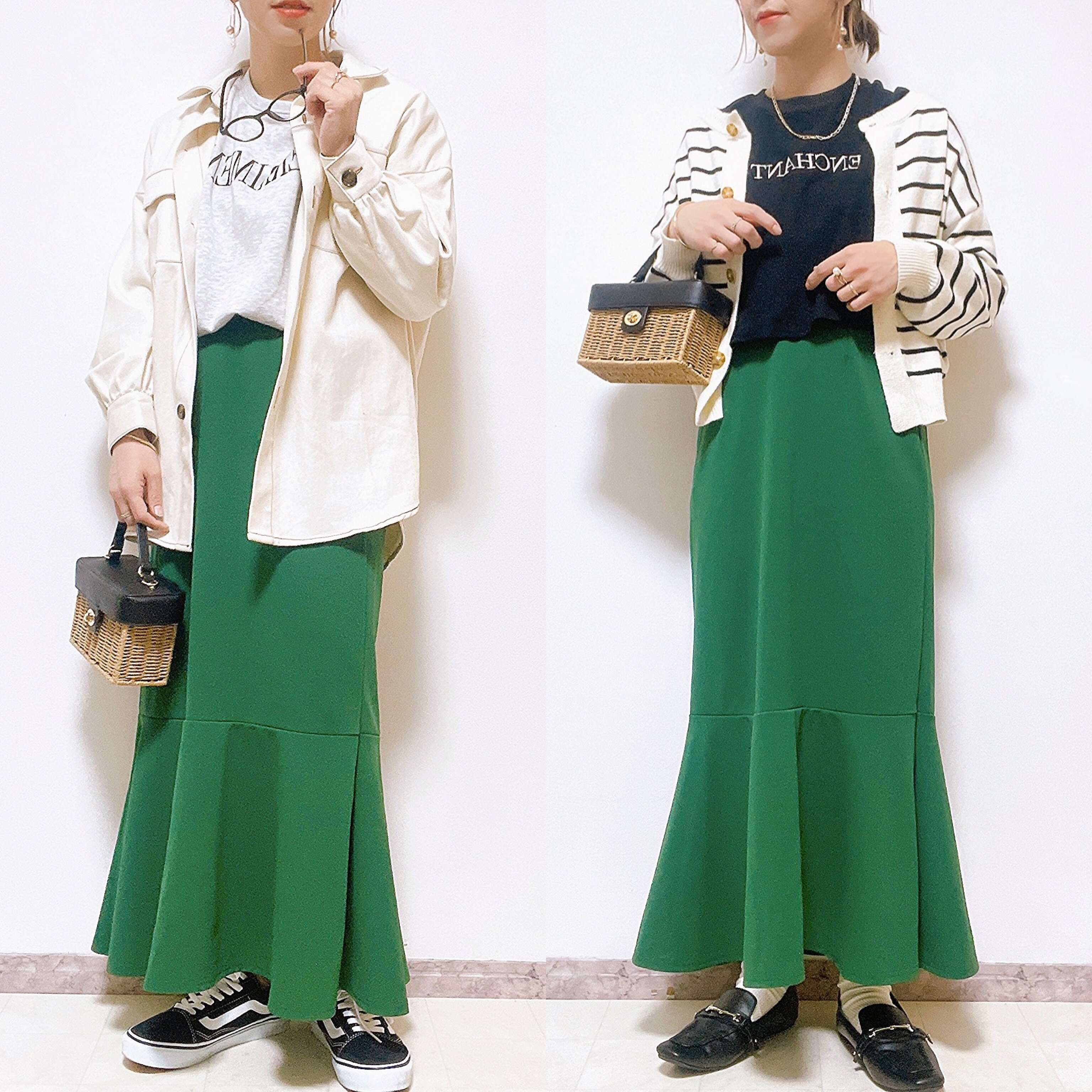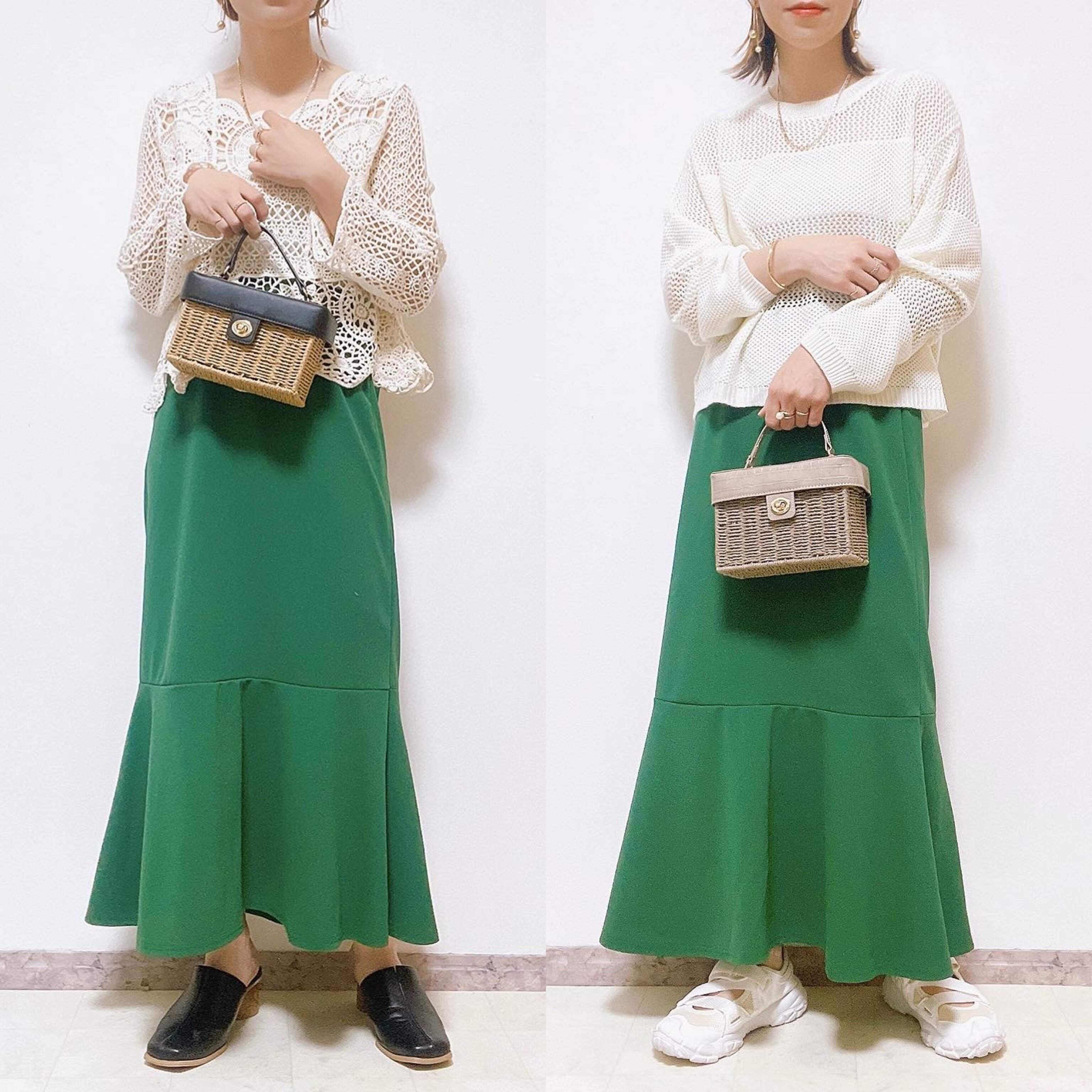 マンネリしがちなマーメイドスカートコーデですが、鮮やかなグリーンカラーで楽しむことができますよ。プチプラなのでなかなか手が出せないカラーものも挑戦しやすいですよね。