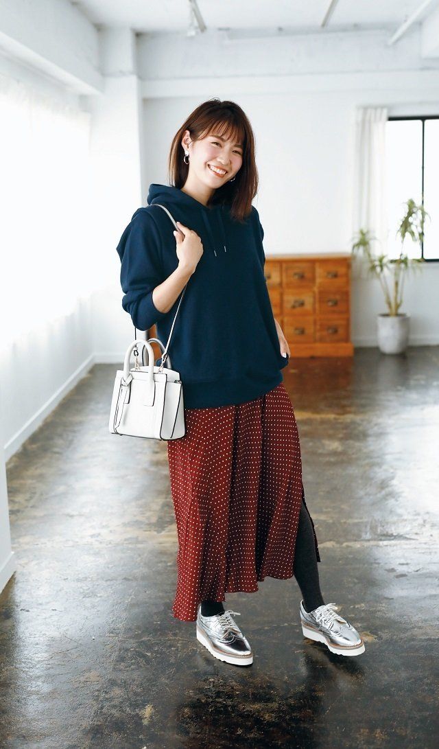 • フェミニン派:定番柄スカートはフーディで!スポーティ要素をたすと旬顔に