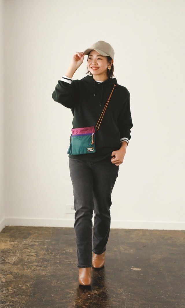フーディ¥2,990/UNIQLO ボーダーカットソー¥8,500/SAINT JAMES(SAINT JAMES 代官山店) デニムパンツ¥5,990/MANGO(LOCONDO) キャップ¥4,900/override(override明治通り店) イヤリング¥18,000/Jouete サコッシュ¥2,900/L.L.Bean ブーツ¥21,000/ダニエラ&ジェマ