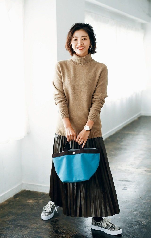 タートルネックラムニット¥2,990/UNIQLO フェイクレザープリーツスカート¥7,500/COTORICA. ピアス¥1,800/アネモネ(サンポークリエイト) 時計¥22,000/モックバーグ(エイチエムエスウォッチストア 表参道) トートバッグ¥25,800/エルベ シャプリエ 代官山店タイツ¥1,000/靴下屋(Tabio) スニーカー¥5,900/RANDA