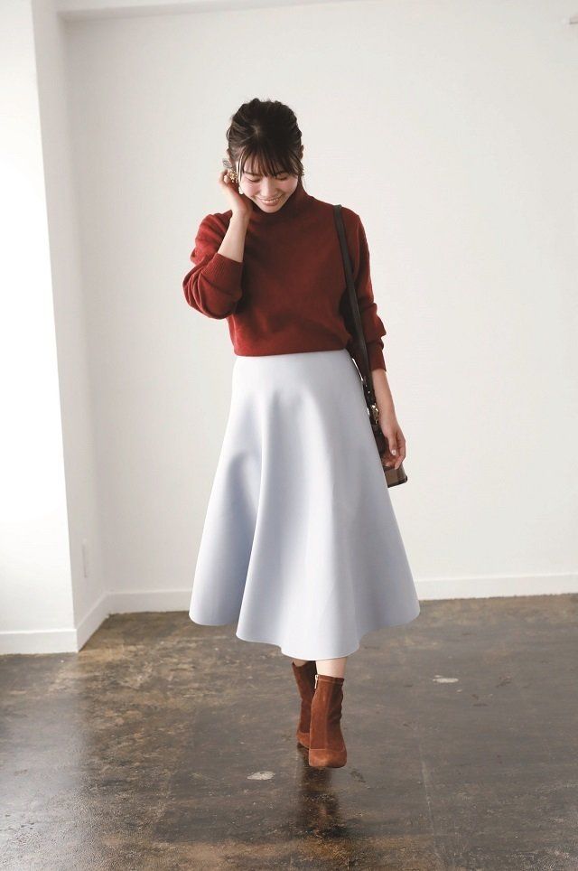タートルネックラムニット¥2,990/UNIQLO フレアスカート¥5,692/BIRTHDAY BASH イヤリング¥2,400/アネモネ(サンポークリエイト) バッグ¥25,000/クリスチャン ヴィラ(ゼアニュウマン新宿) ブーツ¥23,800/ダニエラ&ジェマ