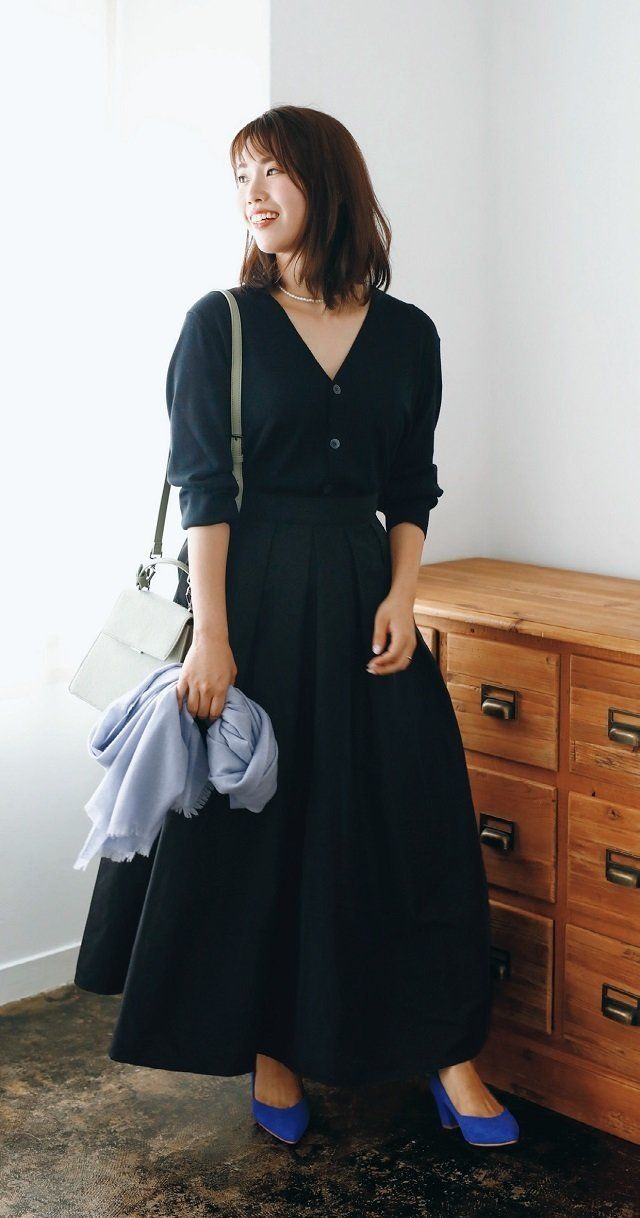 カーディガン¥3,990、ストール¥4,990/UNIQLO タフタスカート¥5,300/BIRTHDAY BASH パールネックレス¥1,600/アネモネ(サンポークリエイト) バッグ¥7,900/CHARLES & KEITH(CHARLES & KEITH JAPAN) パンプス¥12,800/SHOE GALLERY OTA(LOCONDO)