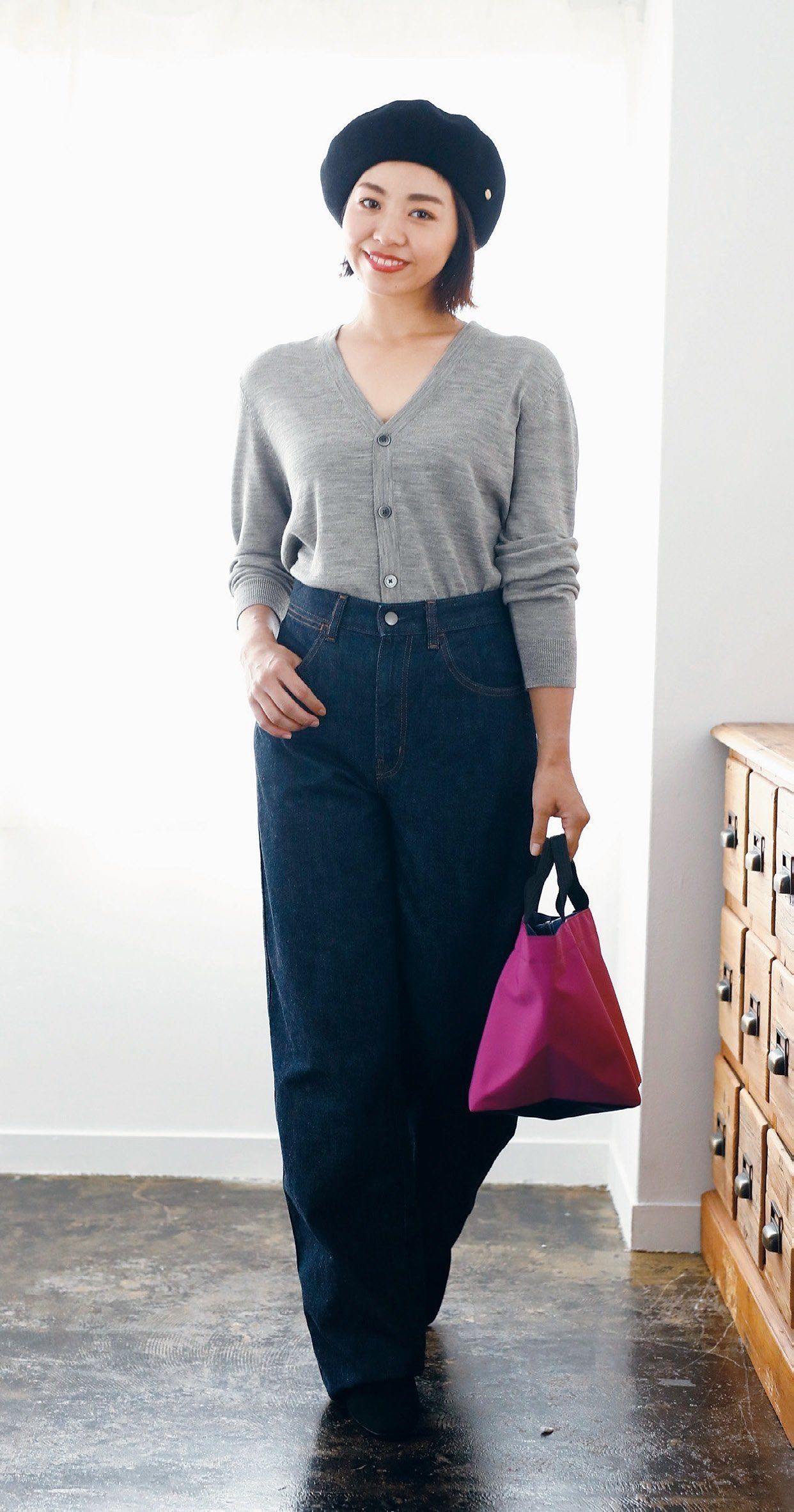 カーディガン¥3,990/UNIQLO ワイドフィットカーブデニム¥3,990/Uniqlo U(UNIQLO) ベレー帽¥5,600/override(override 明治通り店) トートバッグ¥16,800/エルベ シャプリエ 代官山店 ブーツ¥22,000/ダニエラ&ジェマ