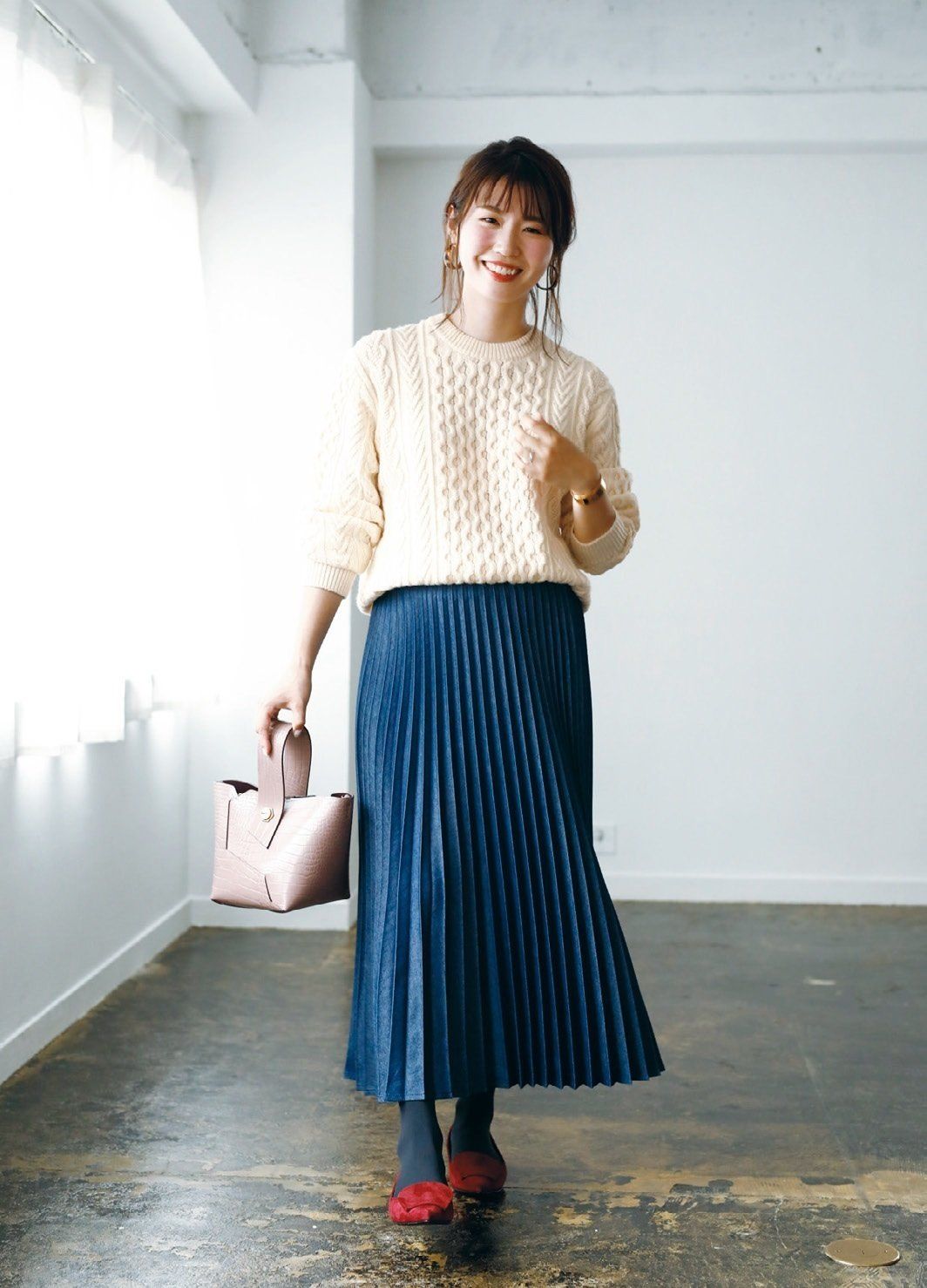 ケーブルニット¥2,990/UNIQLO デニムプリーツスカート¥5,500/COTORICA. ピアス¥1,600/アネモネ(サンポークリエイト) バングル¥15,000/Jouete バッグ¥7,900/CHARLES & KEITH(CHARLES & KEITH JAPAN) タイツ¥1,000/靴下屋(Tabio) フラットシューズ¥24,000/ファビオ ルスコーニ(WASH ルミネ横浜店)