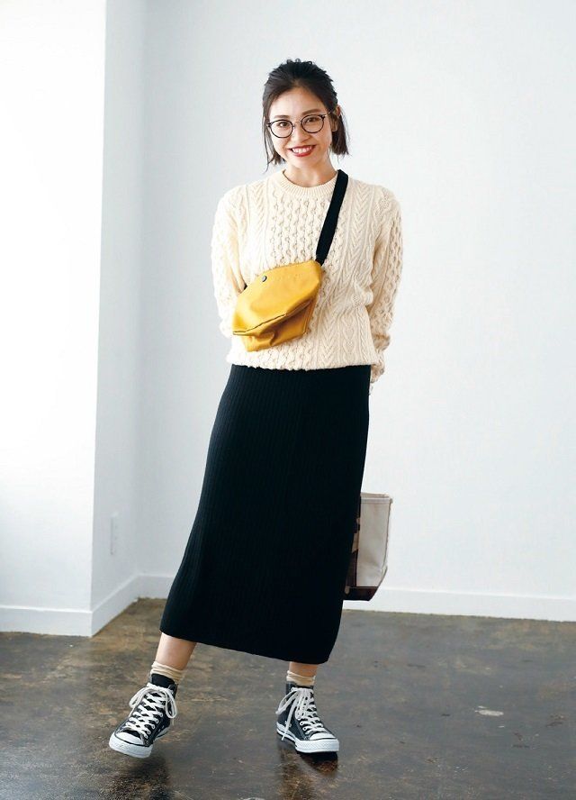 ケーブルニット¥2,990、リブタイトスカート¥2,990、ミニショルダーバッグ¥990/UNIQLO 眼鏡¥12,000/JINS トートバッグ¥5,900/L.L.Bean ソックス¥2,500/ROYALTIES(SAINT JAMES 代官山店) スニーカー¥5,800/コンバース(コンバースインフォメーションセンター)