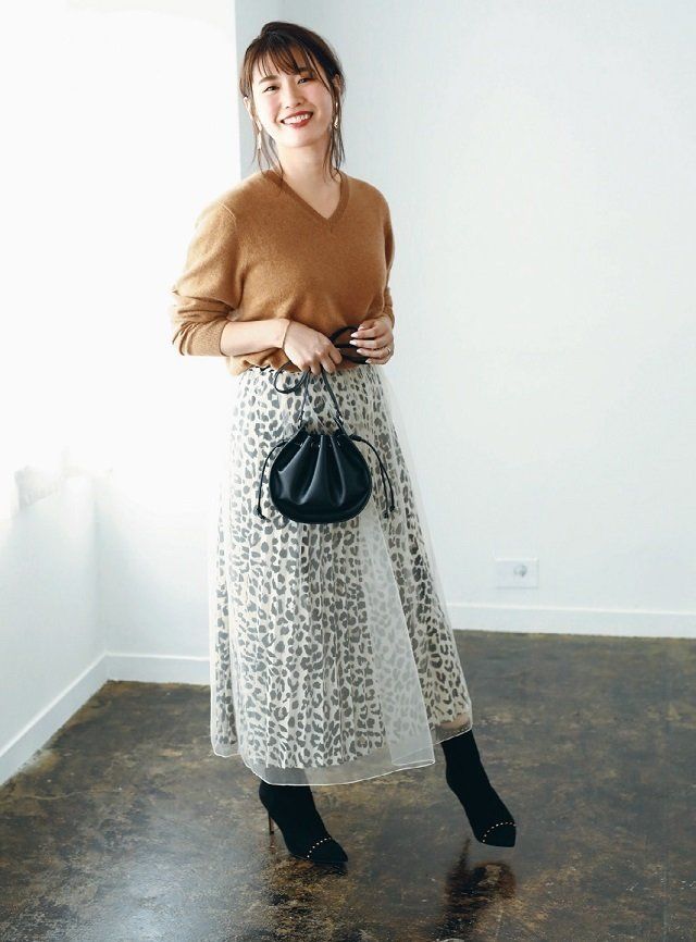 • フェミニン派:レオパード柄スカートなら茶系ワントーンにもメリハリ!