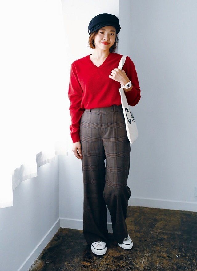 • カジュアル派:チェック柄パンツは “赤ニット”で洗練された印象に