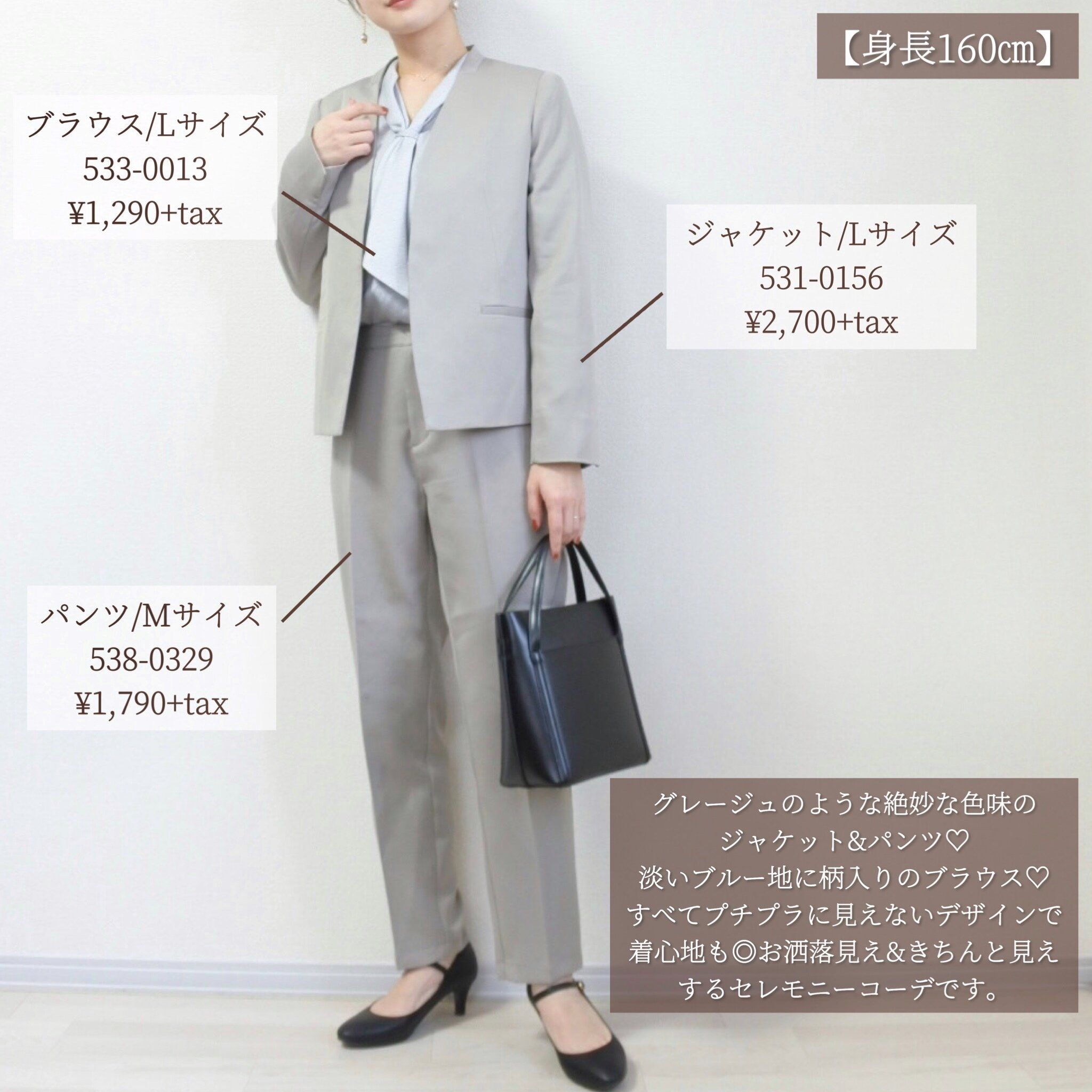 実はしまむらでもセレモニーアイテムが揃うのはご存じでしょうか?数回しか着る機会がないものなので「プチプラで揃えたい!」という方には大変嬉しい価格帯で、なんとジャケット、ブラウス、パンツ総額で6,500円以内で揃ってしまうのです!