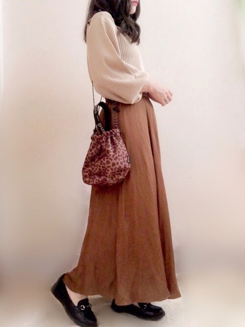 ナチュラルコーデは、黒のビットローファーで引き締めると◎。さらっとしたサテンフレアスカートのすそからチラリとのぞかせて、ラフな印象にきちんと感を与えましょう。シューズは1,900円(税込)。