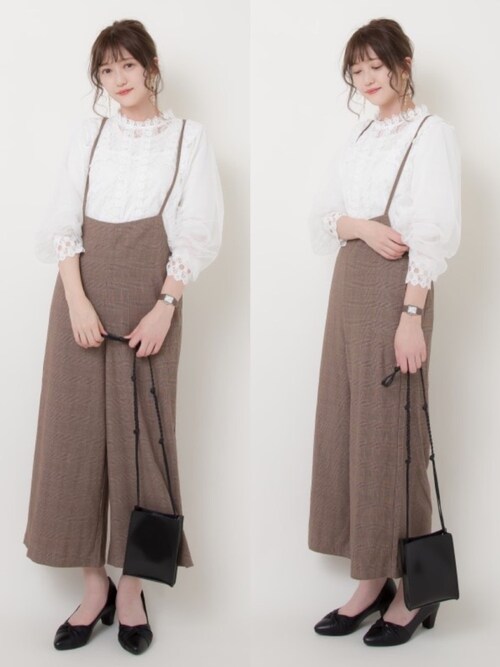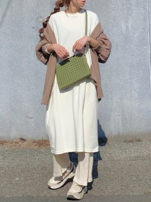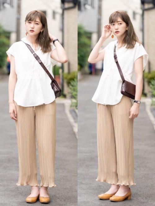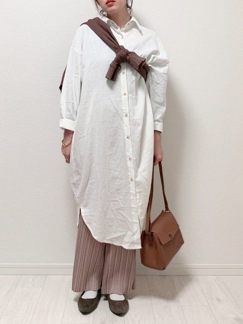 トレンドのシャツワンピ×プリーツパンツを取り入れた、やさしいグラデーションコーデ。パンプスを濃いめのカラーにすることで、落ち着いた雰囲気に仕上がります。たすきがけしたカーデはパンプスと色をそろえると◎。