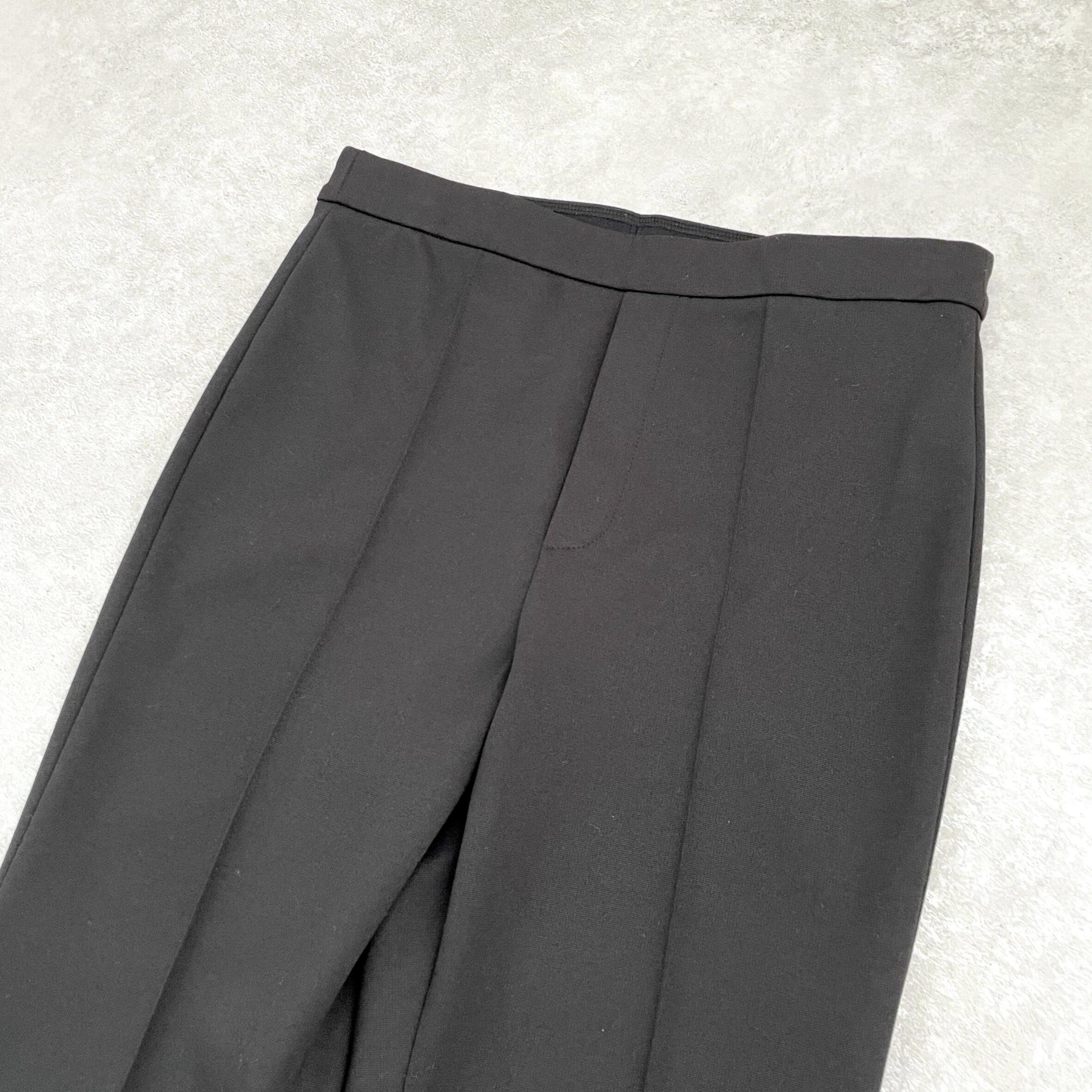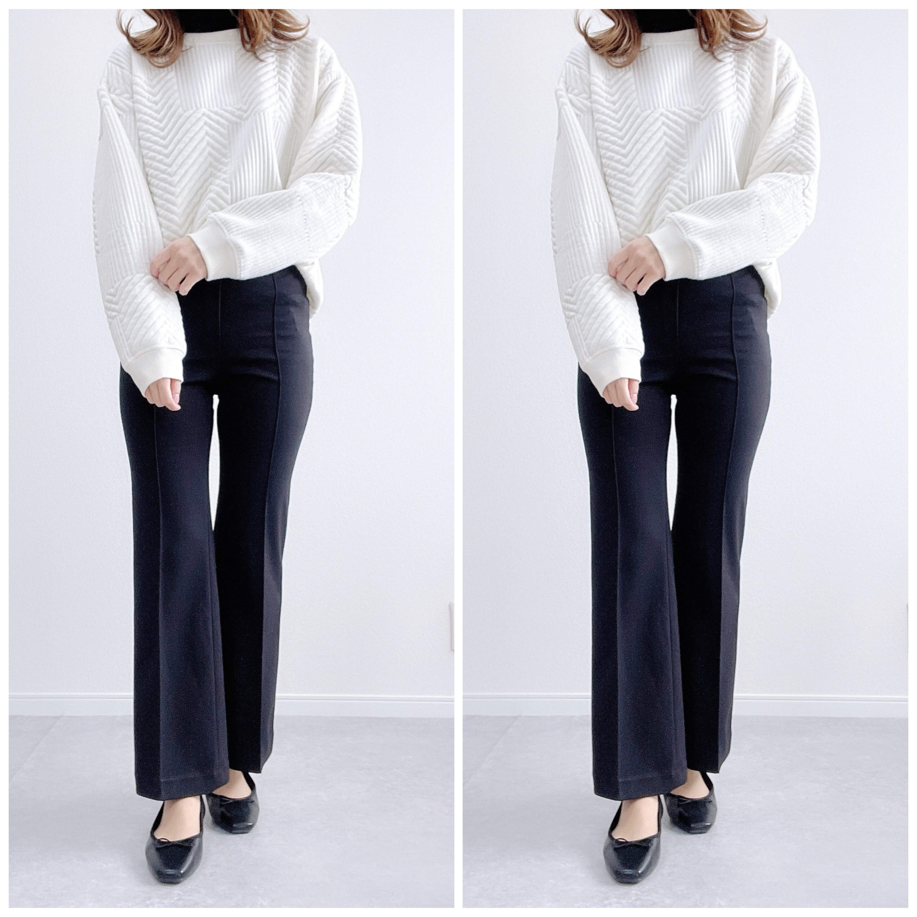 フレアパンツなので膝から下の脚の形を拾わないためO脚の私はよい感じに隠せます。センタープレスが立体的に入っています。こういうタイプのものは形がくずれにくいのでありがたいですよね。