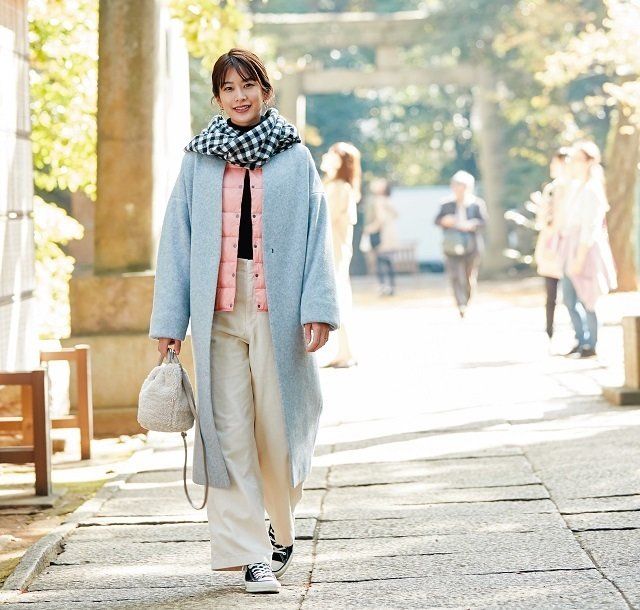 キレイ色のインナーダウンでしっかり防寒しつつ、着こなしのポイントに。明るい色のコートとパンツで軽やかさを演出し、インに着たニットや靴の黒で引き締めて、さらに細見え。