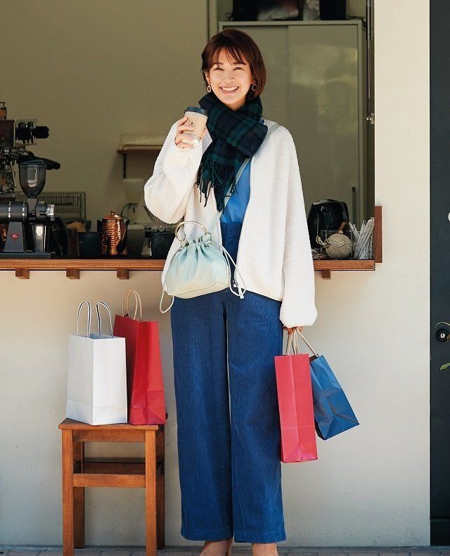 ボアフリースVネックジップブルゾン¥2,990、カシミヤクルーネックニット¥8,990、コーデュロイワイドパンツ¥2,990/UNIQLO イヤリング¥1,400/ロペピクニック パサージュ チェック柄マフラー¥1,810/無印良品 銀座 バッグ¥5,500、ショートブーツ¥8,500/CHARLES &KEITH(CHARLES & KEITH JAPAN)