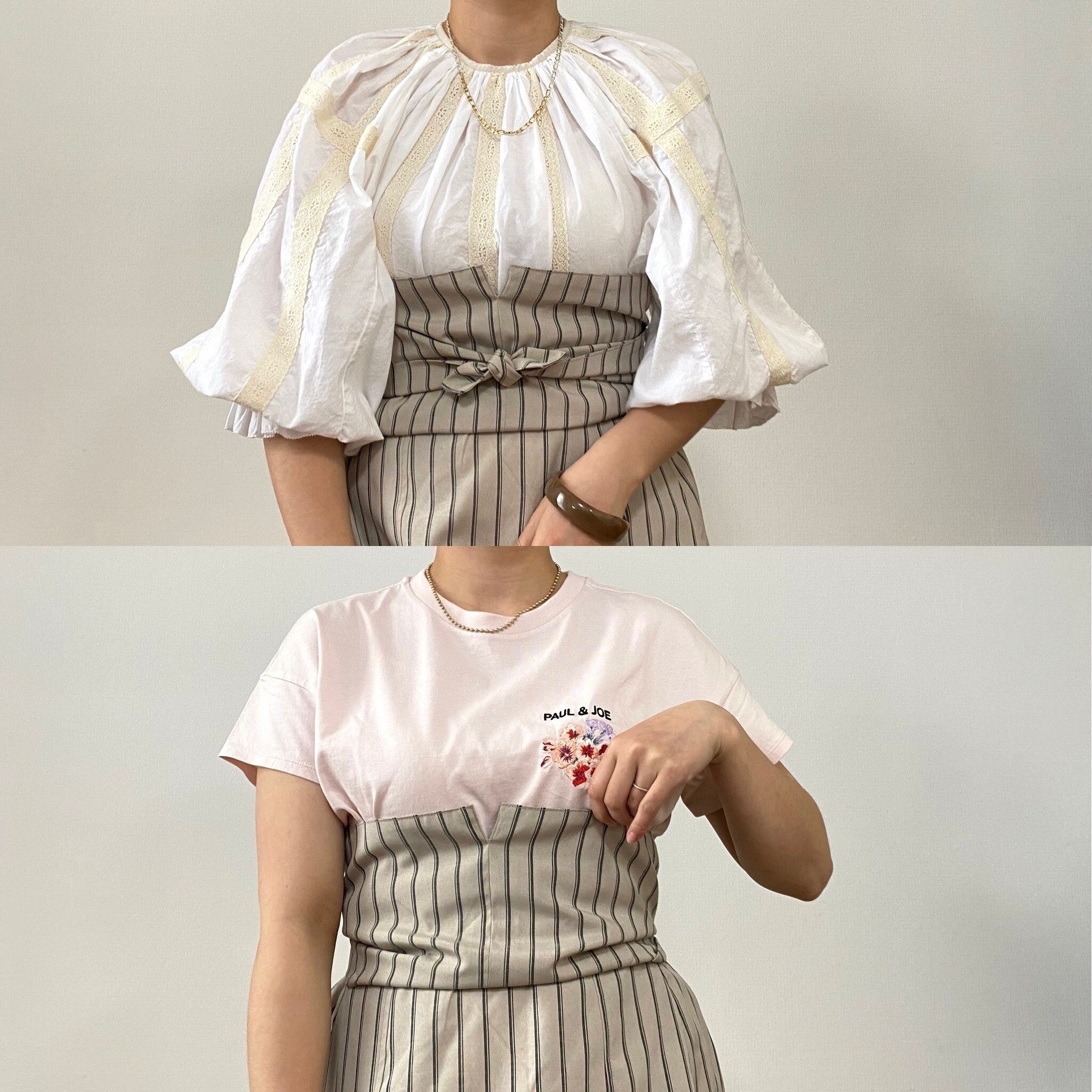 左側は前あてをウエストに当ててぐるっと一周させ、前で結んでいます。ウエストのタイトなシルエットがブラウスのボリューム感とバランスもいいです。