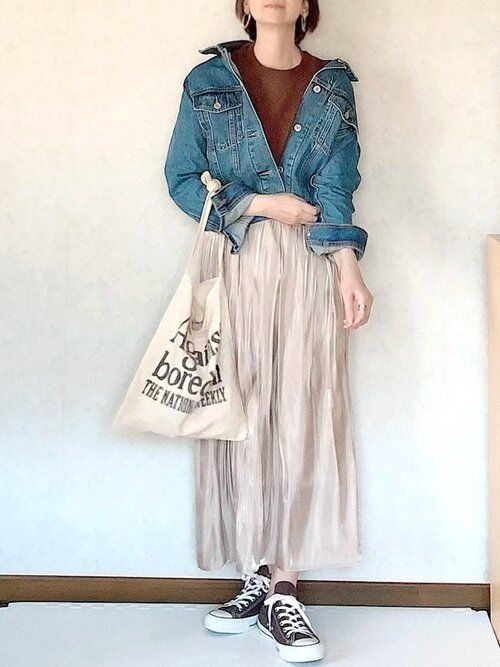 ロングスカートのなかでも特に話題になったプリーツスカート。光沢のあるサテン生地は上品なイメージが強いので、小物でカジュアル感を出すことで、全体のバランスが取りやすくなります。