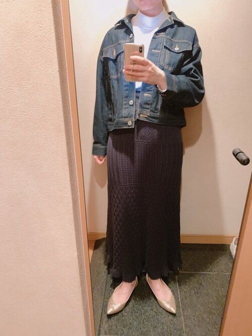 人気の透かし編みスカートに合わせるなら、デニムジャケットも少しレトロライクなカラーがおすすめ。ただそれだけだと古くてオバ見えしがちなので、メタリックなどエッジの効いたアイテムをプラスしましょう。