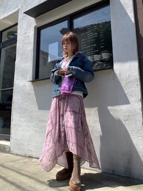 パッチワーク風の総柄とイレギュラーヘムが印象的なワンピース。秋に注目のパープルカラーは、ブルー系のデニムジャケットと色なじみがよく好相性。これからそろえるなら、ぜひパープルを狙ってみてください。