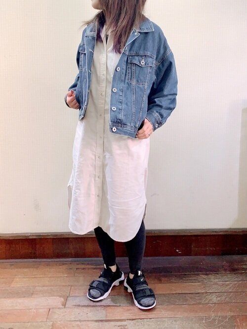丸みのあるえりが女性らしさをアップさせるバンドカラーシャツワンピース。上えりがないのでデニムジャケットを羽織ってもごわつかず、すっきりと決まります。