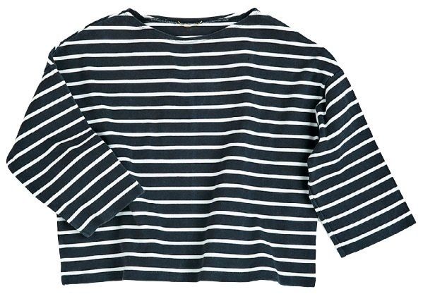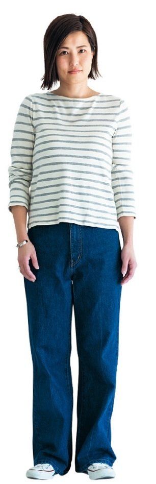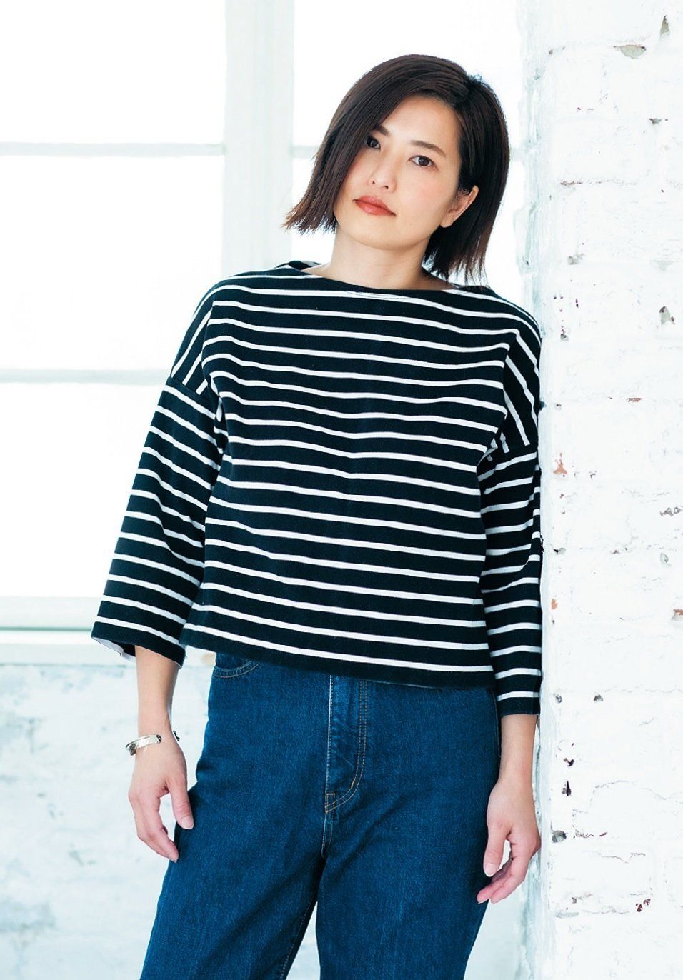 カジュアルの代表ボーダートップスを40代が着るならシックな黒や紺のベースで、体のラインが出ない厚地がベスト。動きやすさをキープしながら、落ち着いた大人カジュアルが完成する。