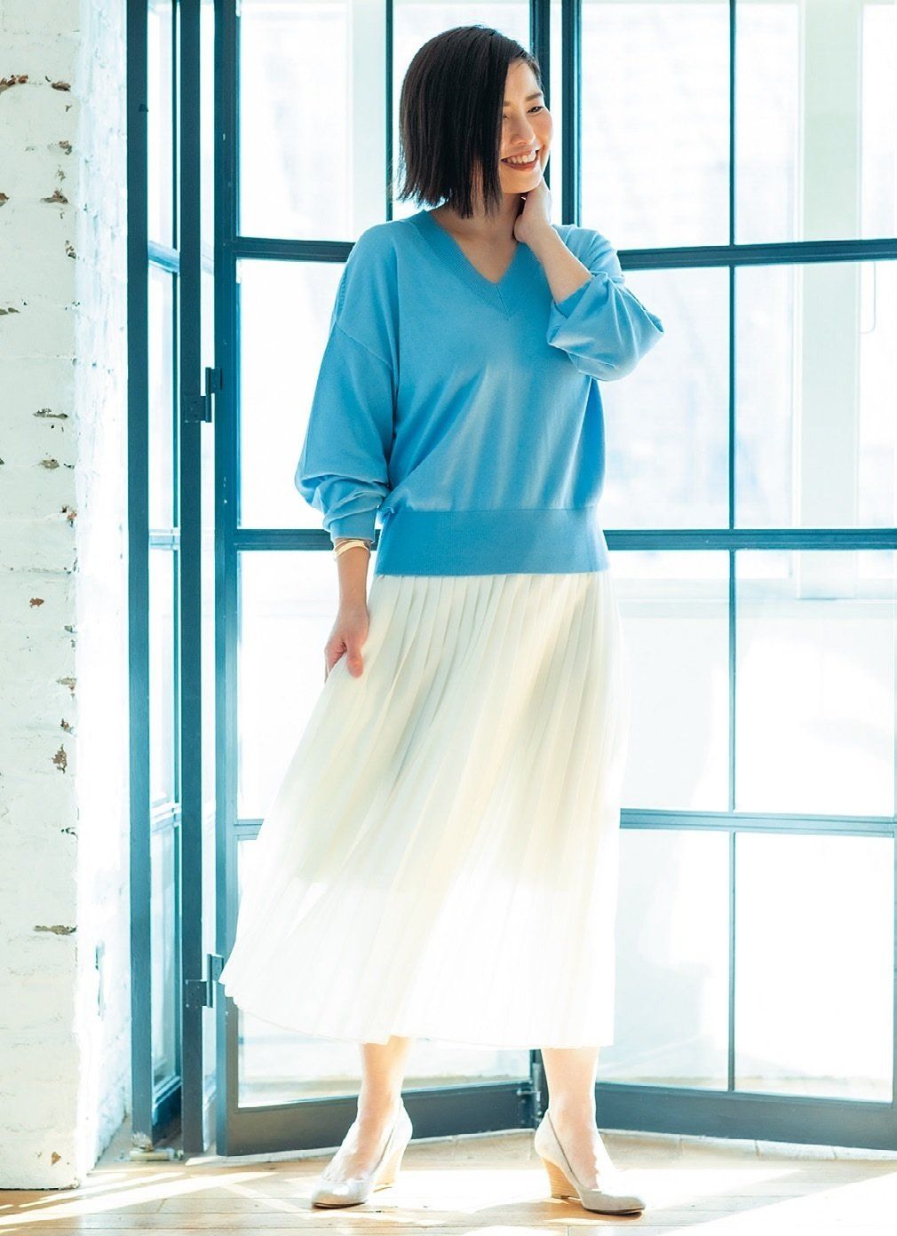 40代がぴったりサイズを着ると、肉感が出て太って見える危険性大。ゆったりしたシルエットで、鎖骨が見えるニットなら着やせ効果もあり。旬のパステルカラーなら顔色も明るく見える。