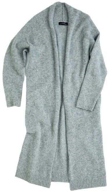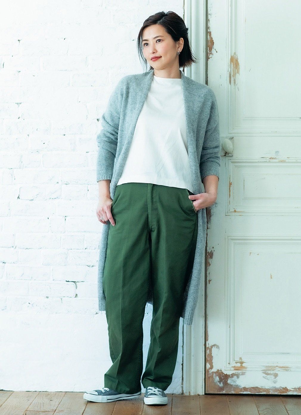 年齢が上がると、高価なブランドパーカーでもやぼったく見えてしまう……。ロングカーディガンなら、おしゃれ度が増し、さらに縦線効果でスッキリ。スカートを合わせてもGOOD!