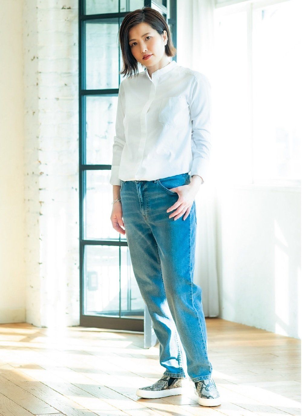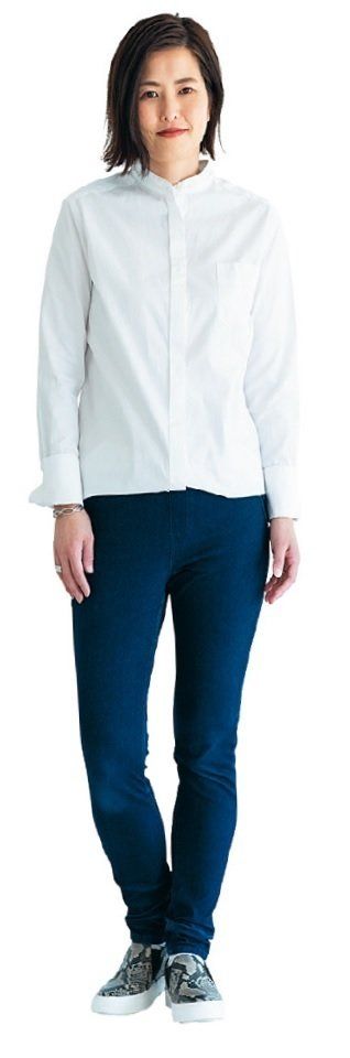 細く見せようとスキニーをはくと、ムチムチ感が出て逆効果。ストレートでストレッチの弱いデニムのほうが肉感が出ず、スッキリ美脚に。ダメージ加工は大人はイタく見えるので×。