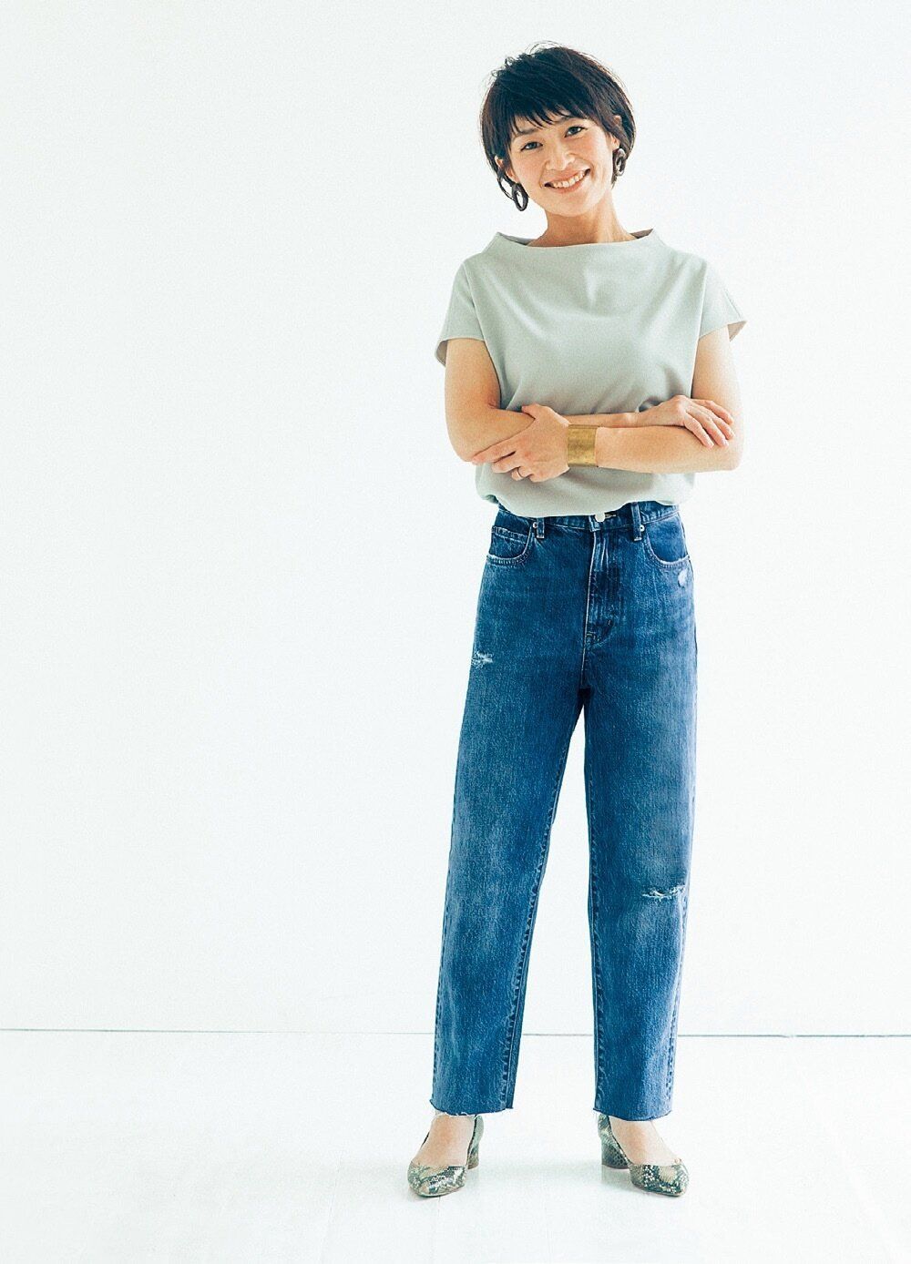 身長157cm。骨格がしっかりしているナチュラルタイプ。「ウエストに比べると脚がしっかりして見えるのが悩み。特にパンツ選びにいつも迷います」。